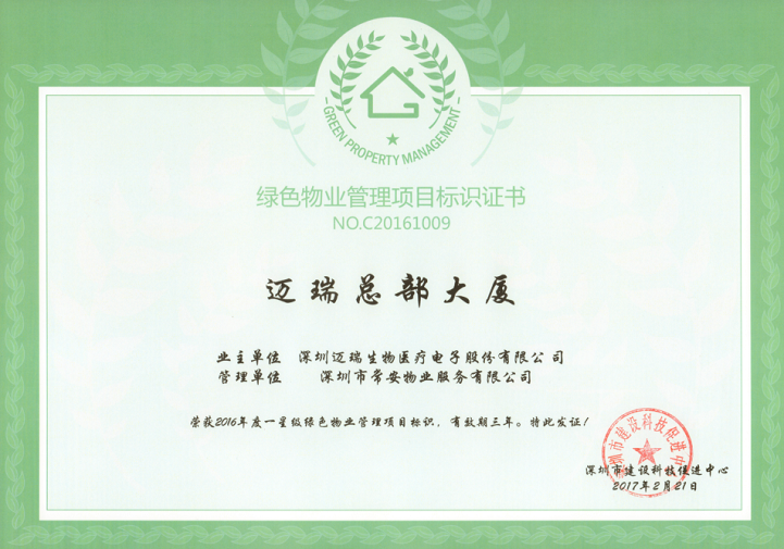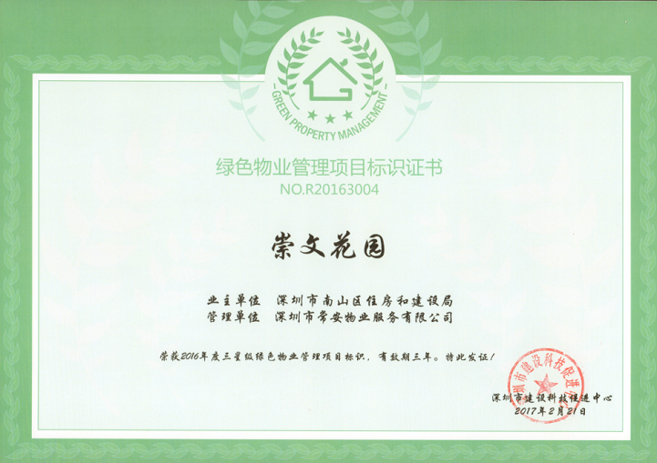 為落實(shí)深圳市住建局關(guān)于《深圳市綠色物業(yè)管理導(dǎo)則(試行)》指導(dǎo)精神,在保證物業(yè)服務(wù)質(zhì)量等基本要求的前提下,通過(guò)科學(xué)管理、技術(shù)改造和行為引導(dǎo),有效降低各類物業(yè)運(yùn)行能耗,最大限度地節(jié)約資源和保護(hù)環(huán)境,致力構(gòu)建節(jié)能低碳生活社區(qū)的物業(yè)管理活動(dòng),實(shí)現(xiàn)城市經(jīng)濟(jì)社會(huì)可持續(xù)發(fā)展目標(biāo),提高物業(yè)管理的科技含量和服務(wù)水平。2016年12月,在公司的正確領(lǐng)導(dǎo)和相關(guān)部門的積極配合下,通過(guò)項(xiàng)目全體員工的共同努力,我司“崇文花園”項(xiàng)目和“邁瑞總部大廈”項(xiàng)目順利通過(guò)了深圳市建設(shè)科技促進(jìn)中心的相關(guān)評(píng)審,分別獲得了“2016年度三星級(jí)綠色物業(yè)管理項(xiàng)目”證書(shū)和“2016年度一星級(jí)綠色物業(yè)管理項(xiàng)目”證書(shū)。