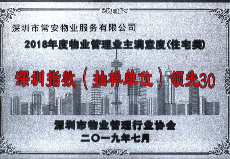 物業(yè)管理業(yè)主滿意度深圳指數測評工作已結束。以此次深圳指數測評所有樣本為主,結合深圳綜合實力 50強滿意度測評、優(yōu)秀項目達標驗收滿意度測評及自主參與滿意度測評所涉及的樣本進行統(tǒng)計,根據測評結果,我司榮獲“2018年度物業(yè)管理業(yè)主滿意度(住宅類)深圳指數(抽樣單位)領先30”的榮譽稱號。